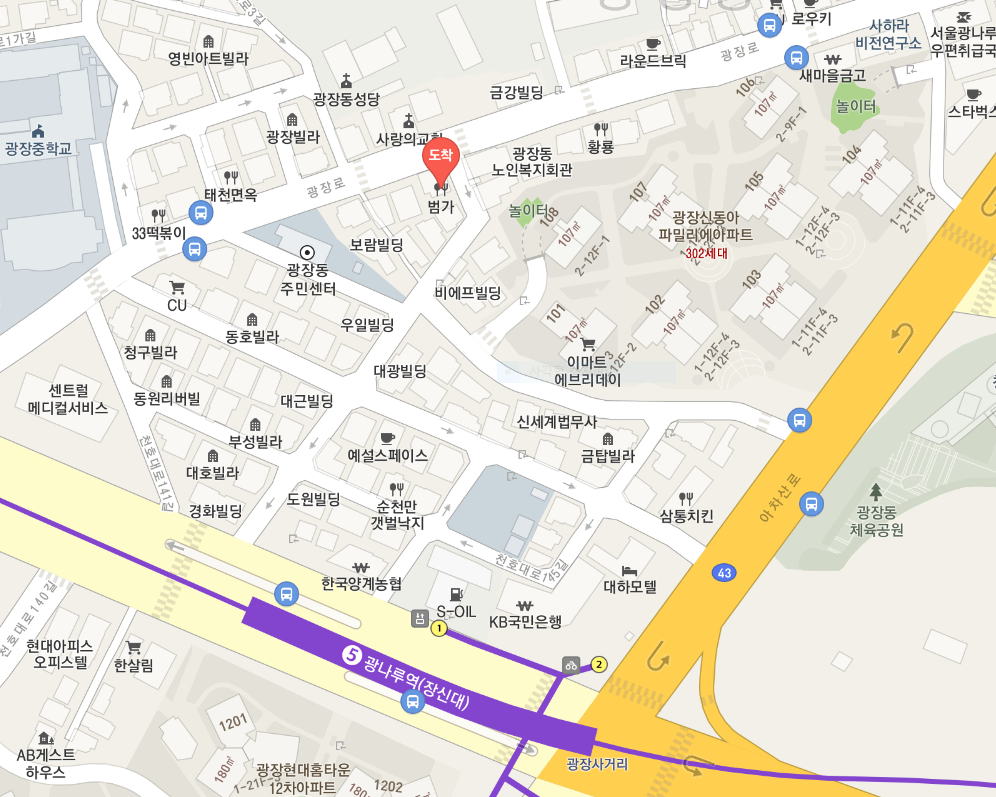 광나루역을 나와 조금(?) 걸어가니 드디어 서울 광진구 광장동 광나루역 인근 범가에 도착했다. 그런데 스마트폰 설명서에는 분명히 이 집을 가리키고 있는데…. 보시다시피 아래와 같이 한자로 쓰여 있습니다… 한자를 배워야겠다고 생각했는데…