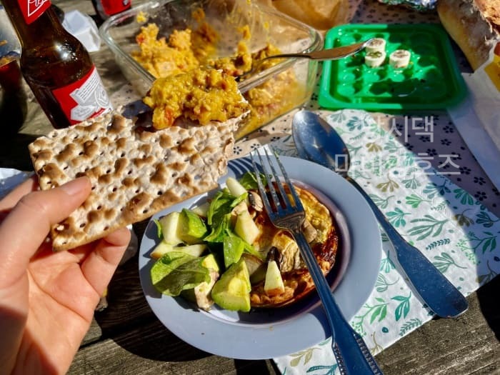 마갈리가 남긴 렌틸콩 카레를 비스킷에 얹어서 가벼운 별미로 만든다.