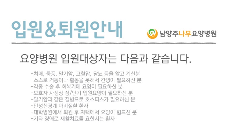 부모님의 병세가 악화되어 갑자기 입원하게 되어 일반병원에서 퇴원해야 하는데 치료가 더 필요한 경우 찾는 곳이 요양병원입니다. 때문에 어떤 요양병원을 선택해야 할지, 어느 부분에 대한 정보를 찾아야 할지 판단하기가 쉽지 않습니다.