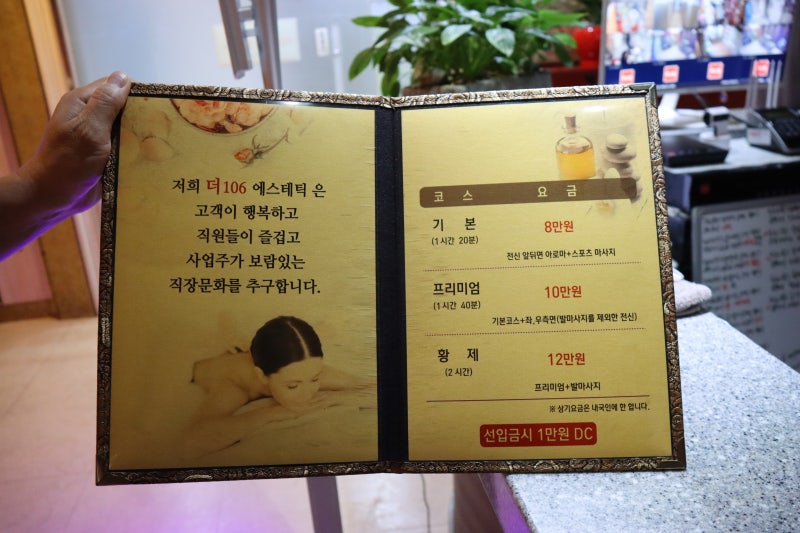 들어가자마자 친절한 직원분들이 맞이해주셨어요. 슬리퍼를 신고 코스 설명을 듣습니다. 전신 스팀 세션이 포함된 패키지를 선택했습니다.
