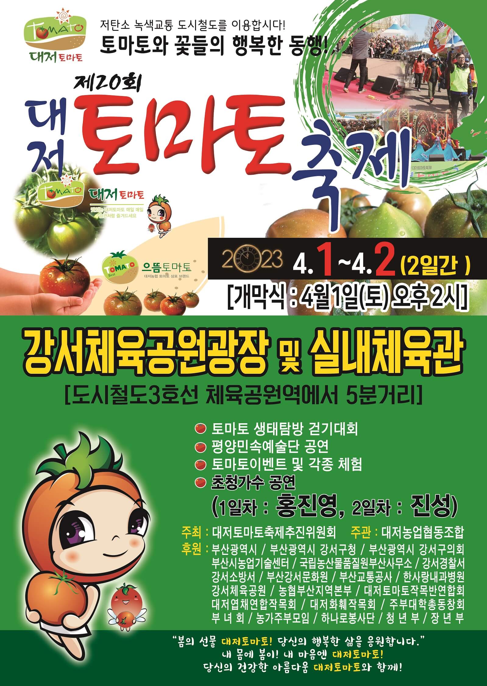 부산 강서구는 제20회 대저토마토축제를 2023년 4월 1일부터 2일(2일간) 강서체육공원 광장 및 실내체육관에서 개최한다고 밝혔다.