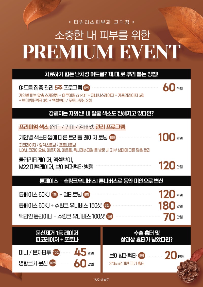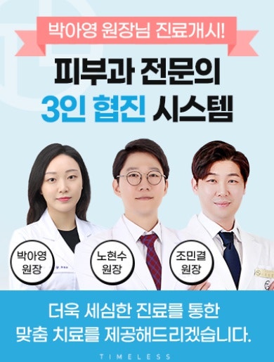 나이가 들어감에 따라 피부 문제는 여기서 그치지 않고 모공, 탄력, 주름 등 복합적인 문제로 발전하는 경우가 많습니다. 피부 상태와 고민에 따라 고민을 해결하고 건강한 피부를 되찾을 수 있도록 타임리스피부과에서 구멍을 뚫어보시길 권해드립니다.