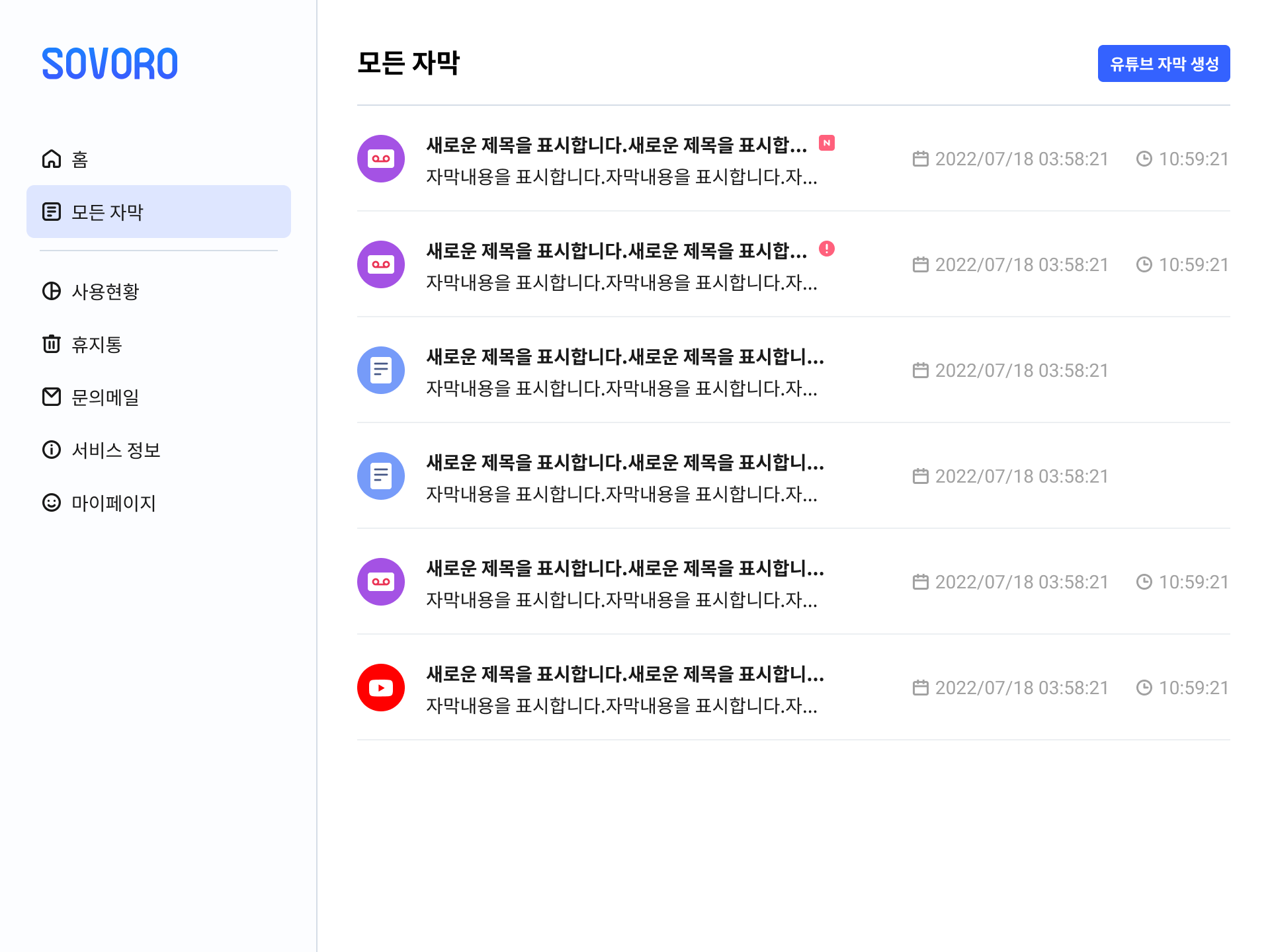 홈 화면에서 소보로 에디터 홈페이지 접속 후 “YouTube 자막 만들기” 버튼을 클릭합니다.하다