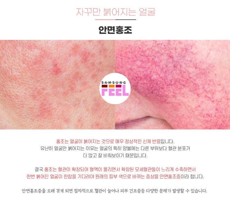 발생된 열이 피부의 모공을 통해 정상적으로 배출되지 못하고 피부 내부에 머물게 되면 남은 열이 피부의 모세혈관을 확장시켜 안면홍조를 유발하게 됩니다. 보통 피부의 모공을 통해 배출되기 때문에 열이 피부 내부에 머물지 않아 홍조 증상이 없습니다. 피부의 온도 조절 기능을 정상화합니다.