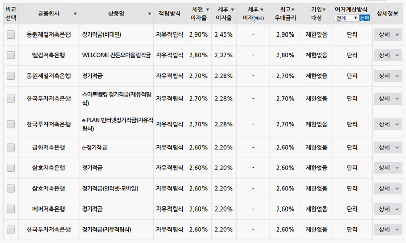 정기적금 금리비교정액적립식 / 단리 / 12개월 / 최고우대금리기준