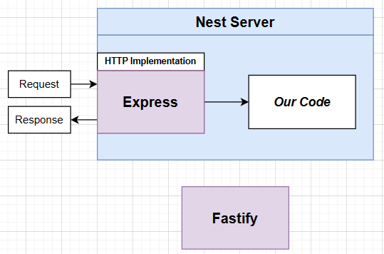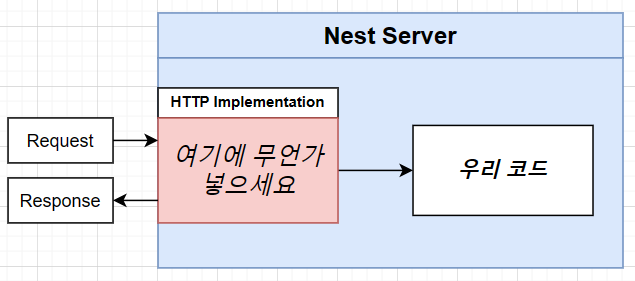 Nest는 요청을 처리하기 위해 외부 구현에 의존하므로 최종적으로 빌드하는 Nest 서버는 HTTP 구현을 연결해야 하는 코드에 위치를 갖게 됩니다.